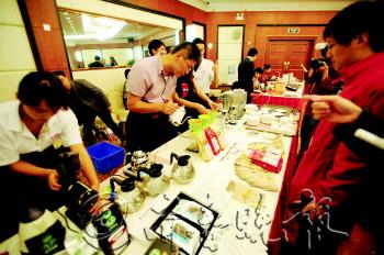 | 舒建新中国画展新闻发布会后,与会者参观普洱咖啡的冲泡过程。 本报记者 戴伟 摄 |  | 舒建新在新闻发布会上。 本报记者 戴伟 摄 |