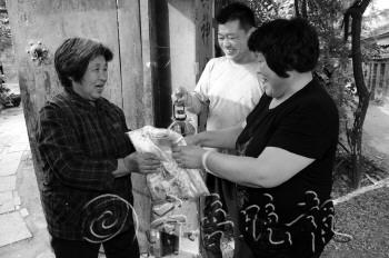 15日,在潍坊市双杨街道湖淋埠村,工作人员将过节礼品送到村里的老年人手中。据工作人员介绍,这是双杨街道湖淋埠村计划生育家庭阳光幸福工程,为全村173名70周岁以上的老年人发放大米、食用油、床上用品等。