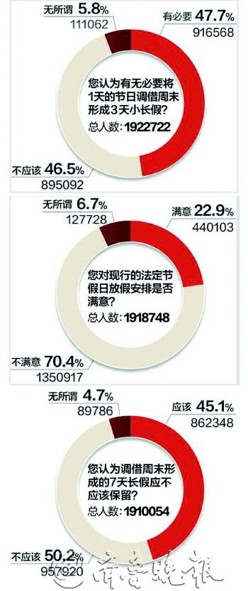 【211万人参与法定假日调查:恢复“五一”黄金周和延长春节假期呼声最高】大多数网友对现行法定节假日放假安排表示不满,而对于是否调借周末形成7天长假、3天小长假的问题,意见分歧严重。特别是针对3天小长假“挪二做三”,反对声尤为强烈。网民呼吁:一是希望恢复“五一”黄金周;二是呼吁延长春节假期。 【@孟非:放假,非诚勿扰!】元旦一天,国庆一天;清明七天,七夕七天,中秋七天,春节七天。理由:1、夏天没有长假不合理。增设七夕长假,既是酷暑天的劳动保障,也方便父母带放暑假的孩子出游。这样,春夏秋冬四季四个长假,让民众充分享受季节更替的美好。2、既尊重传统文化,又体现以人为本。 【@白岩松:坚决取消小长假借调周末】白岩松《新闻1+1》节目中建议:第一,坚决取消清明、端午、中秋借周末调成三天小长假。第二,“十一”长假不仅要保留,“五一”也该恢复,一年中节假日应该从现在的11天增加至15天,这样长假中起码有一个不用再调周末,此时中国的发展节奏也需要这种假日。你同意吗? 【专家A:建议长假总量延至15至21天】北京大学旅游研究与规划中心主任吴必虎建议,“五一”和“十一”可放两个长假,从南方、北方的不同情况,授权各省份自己制定第三个长假,让长假达到21天或者15天总的供给量。同时方案要经过网民以外的其他人征求意见,成立专家组进行研究。 【专家B:春节放假至正月十五不现实,会影响GDP】有专家称,从政府的角度讲,半个月的假期虽然在拉动内需、促进消费方面有所增长,但对于一些劳动密集型行业会有不小的冲击。同时,作为企业来说,所有员工半个月不来上班,有些中小型企业甚至会面临倒闭关门的风险,所以这种建议基本没有可操作性。