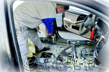 北京现代日照顺新店师傅在修理泡水车辆。