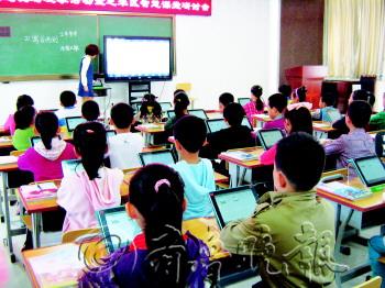 18日,毓璜顶小学的语文课上,小学生人手一本Pad听老师讲课。 本报记者 李楠楠 摄