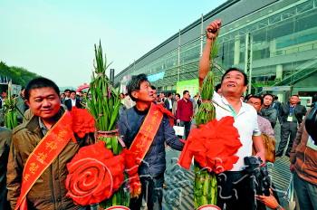 本报10月19日讯(见习记者 王皇) 19日上午,2013年章丘大葱节暨名优农产品展示展销会在济南舜耕国际会展中心广场东侧举行。经过1个小时的测量评选,章丘市王金村苗长茂时隔十六年后,以196.2分的得分再次成为种植状元。新晋“状元葱”高217厘米,因今年比赛比去年早10天,葱高比去年矮了6厘米。 上午八点半,济南舜耕国际会展中心广场东侧15捆大葱一字排开。工作人员正在紧张地测量和统计,统计结果的电脑旁凑了一圈参赛者。这15捆大葱是在17日、18日初选中的优胜葱,15位大葱种植能手一个个小心翼翼地抱葱来测。 9点半时,最终结果出炉,绣惠镇王金村苗长茂脱颖而出,以196.2分的得分高居榜首,“状元葱”高217厘米,与姚明身高有一拼。同村的张九喜、苗发润并列第二。苗长茂今年56岁,种葱已近四十年。 “去年的状元就是我侄儿,今年在镇上测的时候,我的葱就是最高的。”王金村在女郎山下,是章丘大葱的发源地。去年的第一名、第二名都在王金村,苗长茂告诉记者,18日初选时,自己的葱就高过了去年的冠军苗发润,今年夺冠他并不意外。 苗长茂夺冠并不意外还因为他曾经多次进入决赛,得过3个二等奖,1997年的第一届章丘大葱节上,他就是状元。 那时的苗长茂刚40岁,“状元葱”只有197厘米。“奖金也是10000元。”从十几岁就开始种葱,苗长茂对种大葱很有自信。今年再度夺冠,他的经验也很简单,“葱的品种好,种葱的土地好,多年经验自己管理得好。” 此次参赛的大葱都是章丘大葱主栽品种大梧桐,苗长茂说,大梧桐长得高,但是容易倒,要精心爱护。今年夏季连阴雨,他种的7亩葱地有1/5受影响,今年未受影响的葱地亩产能达8000斤。阴雨天苗长茂和媳妇为大葱排水,从早到晚没有闲着。苗长茂说村里大都是老人在种葱,年轻人都外出打工去了。“现在就希望11月收获后能卖个好价钱。”10000元奖金到手后,苗长茂说没什么特别安排,就正常过日子使。 “状元葱”是如何出炉的 见习记者 王皇 章丘市蔬菜技术服务中心技术科科长韩霞介绍,工作人员六点从章丘出发,带着游标卡尺、米尺、电子秤、笔记本电脑和打印机来到比赛现场。比赛开始后,米尺被粘在长桌上,一人用游标卡尺测葱白直径,一人测葱长,一人测葱白长,一人称葱重,两人统计结果。 评分时以100分为基础分,超过规定条件后,高度每增加1厘米加一分,葱白每增加1厘米加2.5分,葱白直径每增加0.1厘米加1分,单株每增加10克加1分。每个选手拿10棵大葱参赛,综合加权平均得出总分。 今年的“状元葱”比去年矮了6厘米,韩霞告诉记者,今年农交会比去年提前了10天,现在正是大葱旺长期,所以高度比去年矮。