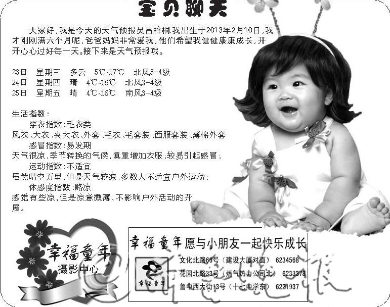 宝贝聊天 大家好,我是今天的天气预报员吕梓桐,我出生于2013年2月10日,我才刚刚满六个月呢,爸爸妈妈非常爱我,他们希望我健健康康成长,开开心心过好每一天。接下来是天气预报哦。