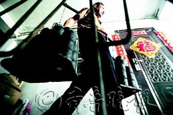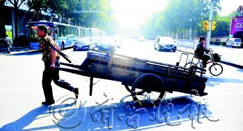 | 李师傅拉着沉重的地排车快速走过斑马线。地排车在城市里已经很少见了。 |  | 虽是深秋,李师傅仍忙得一头汗。 |  | 老式小区没有电梯,只能靠肩挑。 |