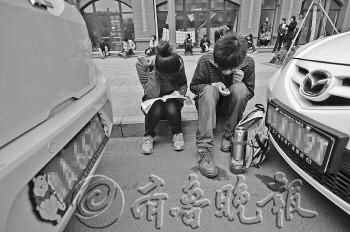 | 2011年4月23日,济南市录用公务员考试开考,两名考生坐在路边待考。 (资料片) CFP供图