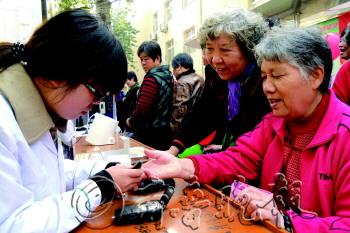 | ▲ 漱玉平民大药店的工作人员为社区居民免费体检。 |  | ▲工作人员为社区居民检查血糖。 |  | ▲工作人员用先进的设备给居民量血压。 |