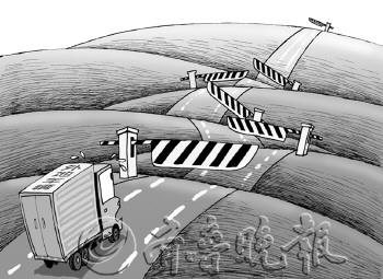 近日有司机反映,河南济源一7公里路段,设有6个收费站点,货车司机必须交两元钱轮胎降温费才能通过。(10月28日《京华时报》) 漫画\李宏宇