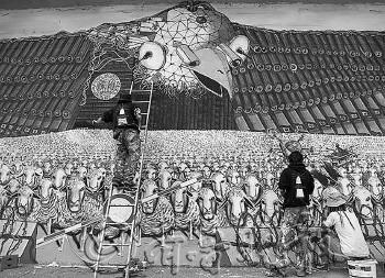 | ▲在德国科隆,三位街头艺术家正在创作大型壁画“适者监视”,用装有摄像头的老鹰讽刺美国意图监控全球(大群绵羊)。 (中新) |