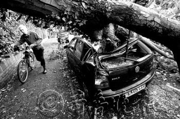 28日,在伦敦北部,一名骑车人经过一辆被吹倒的大树砸中的汽车。        新华/美联