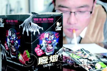 本报济宁10月28日讯(记者 岳茵茵) 一种名为“魔烟”的爽果粉正在济宁城区的小学生中走俏,这种食品配有香烟状吸管,小学生像抽烟或吸毒那样吸食,有时还用鼻孔吸。家长们对此很反感,并指责学校周边的商店不应该出售这种误导孩子的食品。 28日上午,东门大街小学附近的一家文具店正在出售“魔烟”,这种袋装的小零食5毛钱一袋,黑色的包装袋上印着一个魔鬼骷髅头,嘴里冒着烟,外包装上标注着“魔烟”爽果粉、好玩神奇、美味的字样。背面的食用方法中介绍,用塑料吸管吸食‘魔烟’后,张开嘴巴,轻轻呼气即可感受魔烟给你带来的神奇烟雾的惊喜,又在惊喜中享受到清凉甜蜜滋味。除了干吃外,还可以冲饮、制作冰棒。 一店主介绍,“魔烟”非常受欢迎,好多学生都来买!两三天就得卖一盒(每盒30包)。记者买了两包,她立刻递上两根香烟模样的吸管。 随后,记者走访发现,明珠中心小学等学校周边商店中都销售着这种“魔烟”。在随机调查中,几位小学生对“魔烟”相当了解。“我吃过,酸酸甜甜的,挺好吃的。”一个四年级的小学生说。一位三年级的女同学说:“我们班的男生吃过,用烟管吸着吃,就像在抽烟。”另一名学生说,见过有同学把粉末倒在白纸上,再吸着吃,看上去像在吸毒。 记者看到,优必美牌的“魔烟”是广东潮安县庵埠大明食品有限公司生产的,包装袋上印有蓝色的生产许可,配料是葡萄糖、白砂糖、葡萄糖浆和食品添加剂。扫描包装上的条形码,结果是一种名为“泡你糖”的食品和公司厂址。 济宁市第一人民医院儿科医生提醒,大量食用含有添加剂的食品,对孩子身体很不好。如果用鼻子吸,会损害呼吸道。 曲师大教育科学学院副院长唐爱民认为,在学校周边销售这种误导型食品,一些不良影响对孩子来说是潜在和隐现的,当满足一定条件时,可能会一下激发成显性的行为。比如说,吸食过“魔烟”的孩子长大后,如果经济条件允许了,很可能会尝试吸烟、吸毒。这种低档食品,对儿童心理、社会成长都是一种潜在的威胁。