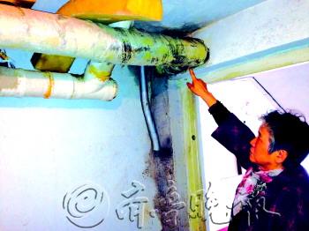 28日上午8点左右,记者来到邮电新苑小区4号楼2楼王女士家中。王女士带着记者到楼底层储藏室,查看了漏水管道。打开储藏室可以闻到一股发霉的味道。房屋内紧贴右侧墙壁,有一根包裹严实的暖气管道,上面的包裹物已有些腐烂。其中,墙角连接处的管道,没有包裹任何东西,上面锈迹斑斑,用手轻轻刮擦,就能掉下铁锈。该连接处,不时向下滴水,周边的墙面被浸湿一片。王女士放了一只水桶,来接滴下的水珠。
