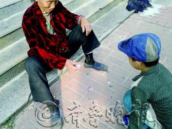 作品描述:人老心不老,和孙子一起玩摔牌,一点不含糊。