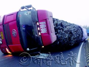 10月28日早上,在京台高速公路聊城出口匝道处,一辆大货车因突然爆胎侧翻在公路中央,所幸没有造成人员伤亡。 本报记者 董传同 通讯员 王伟 摄影报道