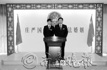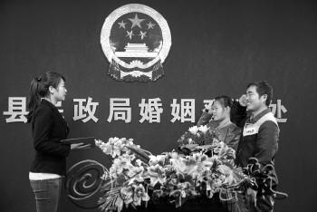 | 25日,莒县婚姻登记处的颁证仪式,在庄严的国旗和国徽下,一对新人庄严宣誓。