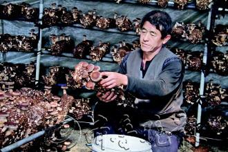 文登市大水泊镇,是威海市著名的香菇生产基地之一,最高年产量曾达到600万斤。今年,受夏季高温影响,大水泊镇的香菇大量减产,菇价也随之下跌,给当地菇农造成了不小的经济损失。图为大水泊镇方家疃菇农方堂昭在菇棚里小心翼翼地摘菇。