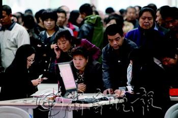 | ▲在市人力资源市场,市民排队领取供暖补贴。 本报记者 王鑫 摄 |