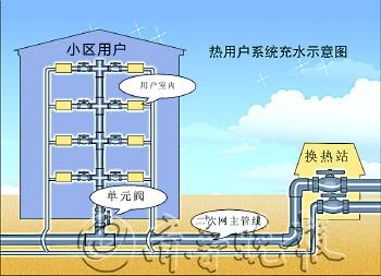| 北郊热电厂的一座锅炉已经点火成功,供暖设备正在进行升温,排出蒸汽。本报记者 蒋龙龙 摄 |  | 打压试水示意图 |