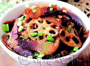 招牌菜 如果您有家藏私房菜,如果您有独家配方DIY,可以来这里露一手! 本期出镜主妇 李晓辉 功用:莲藕肉质肥嫩,口感甜脆,生食堪与梨媲美。中医认为,生食藕能凉血散淤,熟食能补心益肾,具有滋阴养血的功效,可以补五脏之虚,强壮筋骨,补血养血。 食材:藕、腊肉、葱、姜、色拉油、豆瓣酱、糖、淀粉。 做法:1.腊肉清洗干净,锅蒸15分钟后取出,切片备用。 2.藕清洗干净后,去皮切片,入开水锅焯熟,捞出后控干水分,撒入干淀粉拌匀。 3.油烧至六七成热后,将藕片下锅炸,炸至藕片表面金黄色。 4.将豆瓣酱放入锅中,炒出红油后,放入葱姜煸香,倒入炸好的藕片和腊肉片一起翻炒,最后加入白糖翻炒均匀,即可出锅装盘。