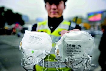 2日,济南雾霾天气比较严重,在泺源大街与泺文路路口,交警时述琳戴上了口罩执勤。4个多小时后,他戴的白色口罩上蒙了一层灰。与新口罩(左)相比,时述琳的口罩明显脏了许多。 本报记者 王媛 摄
