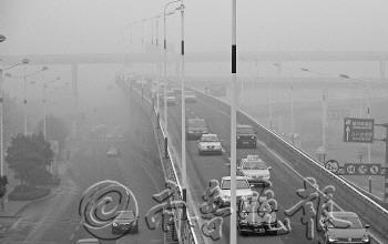 | 2日早晨,一名戴口罩的济南市民骑车行驶在雾霾笼罩的大街上。 本报记者 戴伟 摄 |  | 2日,济南市内高架桥上,车辆缓慢行驶。