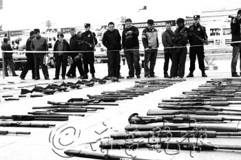 | 中区警方在文化广场展示收缴的枪支和管制刀具。本报记者 岳茵茵 摄 |