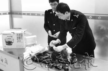 文/本报记者 潘旭业 本报通讯员 苏亮 片/本报通讯员 苏亮 冰毒“戴”浴帽藏身行李箱想蒙混入境;10.5克冰毒“装”香烟想与真香烟一起过关……3日,记者从流亭机场海关获悉,今年查获三起旅客携带冰毒出境案件,共查获冰毒12.8克。据悉,自2008年查获第一起毒品案件以来,流亭机场海关已陆续查获走私毒品案件9起,共查获冰毒4210克。记者盘点发现,毒贩们为携毒出入境,用的花样真不少。 花样一: 冰毒“戴”浴帽藏身行李箱 今年9月9日,流亭机场海关旅检关员对两名旅客进行例行检查时,发现这两名旅客神色紧张,这引起了现场关员的怀疑,于是对该两名旅客的行李进行开包详细查验。 经过检查,关员在两名旅客的行李箱内分别发现了用浴帽缠绕包裹的白色晶体各一包。经鉴定,白色晶体都为冰毒,分别重1.6克和0.7克。目前,海关已对两名嫌疑人依法刑事拘留。 花样二: 冰毒“装”香烟想蒙混出境 今年3月2日,流亭机场海关在一名旅客的行李箱内查获冰毒10.5克。据介绍,该名旅客为将冰毒携带入境,先将冰毒藏匿在两个香烟盒内,然后将藏毒的香烟盒放置在整条香烟的底层,外面还用其他香烟遮挡,最后放在行李箱内,以期蒙混过关,但在走私出境时被海关查获,目前涉案嫌疑人已被海关刑事拘留。 花样三: 11袋毒品嵌进电饼铛 2011年11月7日,流亭机场海关在青岛空港旅检现场查获一起外籍旅客在行李中以电饼铛藏匿携带冰毒出境案。 据流亭机场海关旅检现场关员介绍,该外籍旅客想乘坐当日韩亚航空公司的OZ318航班从青岛飞往韩国仁川,在经过海关出境旅检现场通关时,海关关员检查发现,该旅客行李中的电饼铛图像可疑,开包查验时,在电饼铛上部夹层中发现11个黑色塑料袋包装物,内有粗盐状白色晶体。现场关员迅速对这些白色晶体进行了毒品快速检验和缉毒犬识别,均呈现毒品反应。随后送青岛市公安局鉴定,确定为冰毒,共计毛重725克。 花样四: 茶叶筒内藏有近5斤冰毒 2010年5月12日,流亭机场海关在青岛空港出境旅检渠道查获一起外籍旅客在行李中以茶叶桶伪装藏匿携带冰毒出境案,查获冰毒2475克,该起案件成为青岛海关建关以来自主布控查获毒品数量最大的一起。 据介绍,当天9点30分,一名外籍男性中年旅客欲乘坐青岛—福冈航班经流亭机场海关出境。该旅客仅随身携带一只手提编织袋,且通关时未向海关申报任何物品。现场关员对其行李物品进行X光查验发现,所携编织袋内有圆桶状物品,桶内盛有袋装粉末,X光机图像呈现黄绿色,遂对其行李物品实施开包查验。经查发现,编织袋内装3盒、共计10桶不同包装茶叶,系铁桶密封式包装,但其上无生产日期及生产厂家说明,进一步开拆后发现内有锡纸涂层塑料袋包装固体,打开后发现为真空包装的呈粗盐状白色晶体。经最终鉴定,该旅客所携带白色晶体为“纯度极高的甲基苯丙胺”,即冰毒,共计净重2475克。 花样五: 毒贩腰缠近两斤毒品 2009年5月7日,流亭机场海关在出境旅检渠道查获一起外籍旅客人身藏匿毒品出境案,嫌疑人用黄色胶带在腰部和右腿部捆绑990克冰毒。 据介绍,当天12点30分,一名外籍男性旅客欲乘坐KE890青岛—釜山航班出境。该旅客行李简单,且未向海关申报任何物品。在流亭国际机场安全检查时,安检部门发现当事人用黄色胶带在腰部和右腿部捆绑白色晶状物品。经青岛市公安局鉴定,确定该旅客所携带物品为冰毒,共计990克。