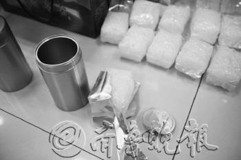 | 海关关员在旅客电饼铛中查获700余克毒品。 |  | ▲在一过境旅客茶叶筒中查获近5斤冰毒。 |  | ◤一过境旅客在腰部和右腿部捆绑990克冰毒被查获。 |