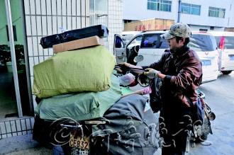 | 快递员背上沉重的包裹,开始了一天的送收件工作。 记者 王震 摄 |