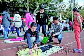 近日,鲸园小学举办了“民生银行杯”第十五届体育节,师生、家长共同参与。据学校老师介绍,目前,学校运动会比赛越来越偏重亲子互动,这样既能让孩子学到东西又能增加父母与孩子间的关系。图为小学生正在进行生活技能大比拼项目比赛。