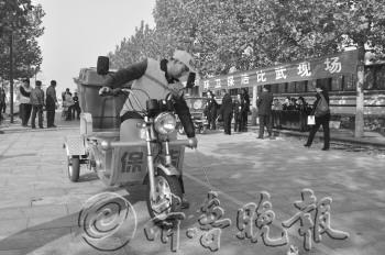 6日上午,第六届全市城管系统岗位技能大比武活动中,电动保洁车快速保洁作业测试,一名保洁员用卫生钳快速夹起地上的一次性筷子。此次活动由市总工会、市住建局和市城管执法局联合举办,共包括队列会操和城管执法、环卫保洁、园林养护、路灯维修、市政养护等比武项目。 本报通讯员 刘新萍 李明 成福国 本报记者 李运恒 摄影报道