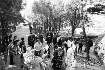 | 7日,在蓬莱阁景区,突然出现的“八仙”引得中外旅行商竞相合影留念。 本报记者 齐金钊 摄 |