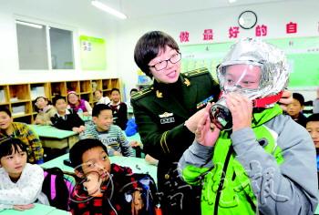 | 8日下午,在山师附小,消防人员讲解应急面罩的使用方法。 本报记者 邱志强 摄 |