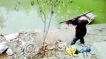见习记者 魏新丽 摄 |  | 工作人员正在岸边清理沙土石块。见习记者 魏新丽 摄 |
