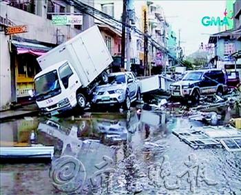 | 这张视频截图显示,8日塔克洛班的街道在台风“海燕”袭击过后一片狼藉。 新华/路透