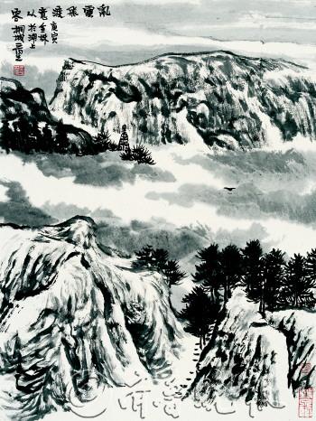◤古道云瀑 33x25cm ◤云岚湿翠 33x25cm ■王平 安徽桐城人,博士。1995年毕业于中国美术学院,同年进入中国美术学院与浙江日报社主办的《美术报》工作;2004年中国美术学院国画系山水专业研究生课程班结业;2008年中国美术学院博士研究生毕业。 现为中国国家画院研究员、艺术信息研究中心主任,中国画学会理事,文化部青联美术工作委员会副主任,《中国国家画廊》执行主编,《中国美术报》执行主编,《中国美术大事记》特约副主编,扬州大学艺术学院兼职硕士研究生导师。系中国美术家协会会员、浙江省作家协会会员。 王平家乡为安徽桐城,是清代“桐城派”文人的故里。这片富有文气的山水万物,文风昌盛的氛围孕育了众多名家,也使其成长过程中受到潜移默化的熏染,并对其气质产生了很大影响。 有了如此的成长背景,王平的山水画也总带有些文气。他的画不是那种剑拔弩张、霸悍雄强,也不是那种精工写实、艳丽悦目,而是天真平淡、含蓄蕴藉、从容挥写心中之性情与山水之本真,一片树丛、一带山丘、一座草亭、几杆青竹,充盈着虚灵氤氲的意象,简约的物象洋溢着满纸葱茏的意象,充满了诗的意境和文的静气。虽不能给人以强烈的视觉冲击力,但却相当耐读,是能够使人越看越觉得有意思,越看越觉得有味道的真正的艺术品。 在王平的艺术空间里,他尝试笔与墨的“两端拉开”的趋势。一端是纯粹的笔,一端是纯粹的墨。其中,“纯粹的墨”主要是积墨法的运用,用淡墨数次重叠,求画面深润、厚重,这其中吸收了不少“二米”的画法。在创作过程中,他一般先以极淡的墨色勾勒轮廓,重在以浓淡变化的墨色依结构烘染,在格调、意趣上与“二米”崇尚的平淡天真比较靠近,有些作品类似没骨法,吸收了没骨法隐迹立形的特点,对画面的模糊处和应分层次处用干浓墨破醒,破醒后再用淡墨水渲染,务使达到深厚而层次分明的境界,表现亦真亦幻的景象,在单纯中求丰富。而创作的另一端,王平则倾向于重墨厚积,构图多大山大水,画面求苍茫浑厚。这一类作品先泼墨写形,浓淡叠加,画面七八分干时,再用焦墨醒笔。总体来说,墨法也呈现出两种趋势:一是淡中求韵,淡中追雅;一是黑中见气势,黑中见厚重。但在技法层面上来讲,还是一致的,不外乎二点:一是积点成文,呼吸浓淡;二是于积墨求厚,于破墨求清。 王平早年做过记者,又是理论方面的专家,既饱览了众家之学,有“腹中有书气自华”的气质,又走过了祖国大江南北及埃及、印度、尼泊尔、美国、欧洲、澳洲等很多地方,看过许多自然风光、文化古迹,接触过不同的文化风情和艺术,践行了“读万卷书行万里路”的古人教诲,丰富了内心的思考。这种气质的形成是当代美术教育体制所欠缺的,也是王平的天然优势。在生活节奏紧凑的今天,急功近利的心理成为主流,画者无法平心静气去锤炼笔墨,但王平似乎还很好地保持着那份从容,这与其气质的养成不无关系。他的画努力阐述着自我与世界、人性与自然、历史与当代之间的关系,并以叙述者的身份将这种灵性空间放大为一个世界。他深入到生命的灵性世界,怀着一种对质朴人性和灵性世界的崇敬,以执着和澹然的绘画态度,描绘着当代水墨的存在状态,陈述着人与山水之间亲密无间的联系,把生活现实与生命幻想、朴实心态联系了起来,令人观之静心而悠然。 (东野升珍) ◤乱云飞渡意从容 68x45cm ◤观云台 33x25cm ◤秋风起白云飞 68x45cm