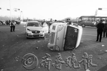 10日,在104国道与经五路路口处,一辆轿车与一辆面包车发生碰撞,致面包车侧翻,幸无人员伤亡。