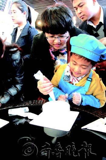 11月10日,齐鲁晚报20名小记者走进巴黎一刻烘焙坊当了一回蛋糕师,他们穿着围裙,戴着帽子和袖套,挥舞着手中的奶油条,制作了一个个充满童真童趣的蛋糕。可爱的卡通小白兔在小记者们的设计下,变得趣味十足。小记者们纷纷表示,自己做的蛋糕格外香甜。 亲子游戏 培养小记者和家长默契 下午三点,小记者们在巴黎一刻烘焙坊集合完毕。一走进蛋糕店,迎面而来的浓郁奶香让小记者们垂涎欲滴。看到橱柜中一个个好看的蛋糕,小记者们跃跃欲试,开始热烈地讨论着一会做个什么样的蛋糕。“那个足球的蛋糕真好看,我也想做一个一样的……”一名小记者说。 为了增加家长和小记者们互动,活动开始前,小记者们先进行了热身运动,和家长一起做亲子游戏。游戏的规则是将家长的一条腿和小记者的一条腿绑在一起,共同前进,动作最快那组获胜。看似简单的小游戏,其实需要家长和孩子的配合,必须劲往一处使才能共同前进。 游戏开始后,有的家长和孩子边喊着口号边前进,很快就进入不错的状态。但也有部分家长和小记者遇到不少难题,一不小心就会被绊倒,或者怎么也走不起来。几轮游戏下来,家长和孩子们的配合越发默契。“平时工作忙,很少有时间和孩子一起轻松地玩玩游戏,这样的方式很好,我们玩得很开心。”家长蔺女士说。 小记者变蛋糕师 “画”出形态各异的兔子 游戏结束后,就到了孩子们最为期待的时刻。小记者们穿上巴黎一刻烘焙坊统一准备的蛋糕师服装,小记者们顿时找到了专业蛋糕师的感觉。“这身衣服真好看,穿上真帅气。”小记者李炳呈开心地说。 第一次走进蛋糕店,除了孩子们,家长们也很兴奋,在一旁不停地为小记者们合影留念。“活动组织方很用心,还为孩子们量身打造了这么好看的围裙、帽子,穿上真的很好看。” 今天,小记者们的任务是在涂满白色奶油的蛋糕胚上画一只可爱的小兔子。或许对孩子们来说,用画笔画一只小兔子不是难事,但是要是操作起粗粗的奶油条来,就不那么简单了。 在工作人员的引导下,小记者拿起粉色的奶油条在蛋糕上勾勒小兔子的形状,圆圆的脸被孩子们画成了三角、四边形等稀奇古怪的形状,瘦长的耳朵也变成了熊耳朵、猫耳朵…… 尽管如此,孩子们还是沉浸在创作的乐趣当中,并发挥了想象力运用巧克力酱、五角星的糖果和银色的糖果来进行装饰。简单的材料,经过精心的搭配,在孩子们手中成为一件件艺术品。尽管形态各异,看着自己的“杰作”逐渐完工,小记者们充满了成就感。“做蛋糕真好玩,就是这个小兔子太胖了,不过还是感觉很可爱。”小记者王艺璇说。 活动结束后,孩子们将自己亲手制作的蛋糕打包带回家。“这是我制作的第一个蛋糕,感觉好诱人呀,我要带回家和爸爸妈妈一起分享。”小记者辛知霖说。 文/本报记者 张萍 片/本报记者 刘涛