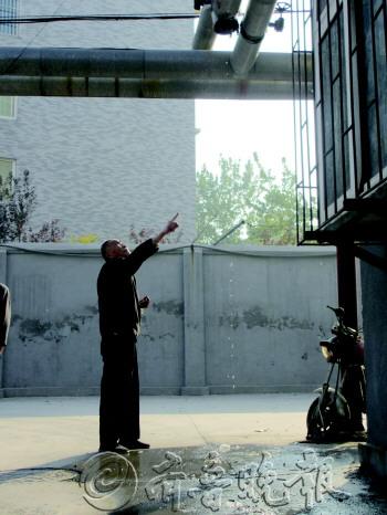 | 一居民指着供暖主管道说,供暖马上开始,可管道漏水越来越严重。 本报记者 张汝树 摄 |