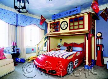 □人物:Kimi □儿童房类型:汽车总动员 打造方法: 这间儿童房,没有按部就班地用白顶蓝墙。顶棚简洁利落,绘上了蓝天白云,配上蓝色的星星点点窗帘和蔚蓝色墙面,令视觉一下子开阔不少。房间的主体部分,就是那大红色的跑车造型床和二层的机修房,再配以加油站造型的搁物架,赛车令旗和汽车玩具,一个动感十足的赛车补给站呼之欲出。