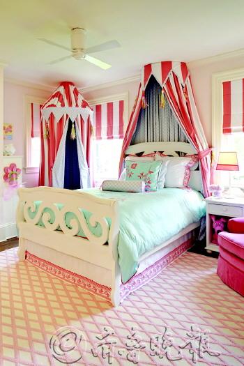 女孩房搭配技巧: 设计主要以恬静、柔美为主题,用嫩粉、淡紫等温馨的色彩作为主色调再合适不过了。“小公主”们喜爱的卡通动物或花朵图案都能成为女孩房的主题,配以精致布艺、纱帘幔帐,就能将童真与浪漫体现得淋漓尽致。 (张德生)