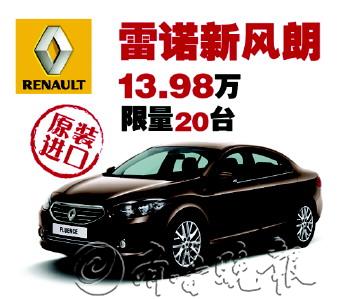 这年头,高端品牌动辄几万的优惠早就弱爆了,但都是针对几十万以上的车型,十几万的原装进口车也能这么疯狂你见过没?没见过?来,原装进口A级轿车雷诺新风朗出来亮个相吧! 雷诺新风朗独家买断车型贺岁钜惠! 雷诺新风朗原装进口交2000抵20000! 雷诺新风朗,A级原装进口轿车! 雷诺新风朗全国仅此一次,限时限量,先到先得! 即日起,为庆祝雷诺新风朗销量过万台,山东吉通·雷诺汽车4S店独家买断车型贺岁钜惠!整车进口雷诺新风朗交2000抵20000,原价15.78万现价仅售13.98万,限量20台,11月30日前提车有效!不仅如此,雷诺全系还享5年或12万公里免费保养,让您5年保养不花钱!如此强势的促销力度,您还在等什么?A级原装进口轿车,促销力度空前,错过就是过错,千万不要犹豫了! 雷诺新风朗,世界冠军之选! 雷诺新风朗,世界冠军车手莱科宁首选座驾,2.0L排量匹配CVT无级变速器,将众多智能装备囊括于身,全新配备高精度数字仪表盘、智能电子驻车系统、智能卡片钥匙,为凌厉动感赋予全新智感。 <雷诺汽车购车超值礼遇>: 1.进口SUV新科雷傲,19.98万起; 2.3年或10万公里整车保修; 3.发动机总成和变速箱总成保修期5年或12万公里; 4.5年或12万公里免费保养; 5.五年免费24小时道路救援服务; 6.免费洗车、免费检测; 7.凭车钥匙在省体首家汽车主题西餐厅SUBARU·名典咖啡免费喝。 雷诺汽车 百年只造安全车 山东吉通4S店: 经十西路店: 电话:0531-8729 2268 工业南路店: 电话:0531-8855 9600 省体育中心店: 电话:0531-8202 0058