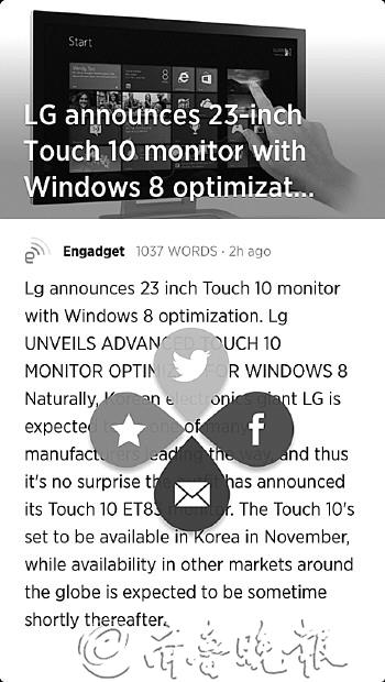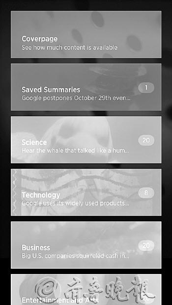 打开Summly之后,手机屏幕上会显示一组彩色条块,每个条块对应一个新闻主题,点击后可获得与主题相关的一系列新闻摘要,摘要文本刚好填满手机屏幕。经过再次触碰后,页面会弹出一个四瓣花形状的分享按钮。Summly和新闻机构,在提供摘要后可以通过链接跳转至原文章页面,为新闻机构带去流量。