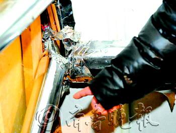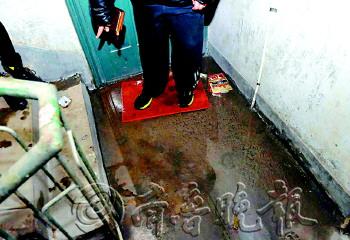 | 居民文先生指着管道的裂口说,管道就是在这里爆裂的,热水哗哗从4楼的楼梯间往下流淌。 本报记者 邱志强 摄 |  | 总闸关闭后,水流停止了,但楼梯间还存有积水。