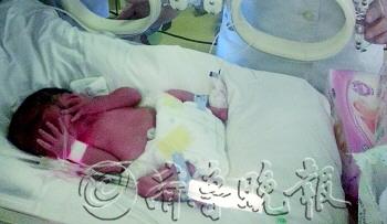 | 刘志芬路过儿科监护室,特地来看了看宝宝,图为老大。 本报记者 宋佳 摄 |  | ▲老二双手遮脸,好似很害羞,护士称赞超萌。 本报记者 宋佳 摄 |  | ◤老三在呼呼大睡。 本报记者 宋佳 摄 |