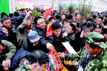 本报11月19日讯(记者 李娜) 19日,第十届北方(烟台)果树苗木·生产资料交易会召开,参展商130余家,各类苗木和生产资料200余种,苗木交易会持续到21日。果树面临更新换代,加上今年涝灾致树木死亡,来购买苗木的果农超过以往任何一届,预计今年参会果农将超15万人次。 在烟台市农科院外,面包车从福山外夹河大桥一直排到山后村站公交站点附近,有一千多米长。“不到8点钟,我们就到了。”招远果农林杰风说,他和同村四个果农一早赶到苗木会,就是为了能买到好苗子。他们村有来晚的,把车都停在外夹河桥了。他有5亩果园,这里面有一半果树树龄已经到了25年,需要换新树苗了。 上午9点多,三五成群的果农不断涌入烟台市农科院,还有果农扛着苗木往外走。“我以为进门就是会场了,结果走到里面才有售票处,通过检票口,又挤过很多人才到了会场。”第一次来交易会的一位老农,看到这热闹场面惊讶不已。 烟台市农科院副院长姜中武介绍说,这次展会有3个亮点,“果农多、参展商多、参会专家多”。展会不仅苗木商和农资展商多,前来给果农解疑答惑的专家阵容也很强大。 第十届北方(烟台)果树苗木·生产资料交易会共设立256个展位,228个标准室内展位和28个室外展位,不到一周时间即被抢订一空。由于展位数量有限,今年多家参展商已将明年和后年的展位也一同预订了。 据了解,本次交易会的参展商主要为科研院所、果业合作社以及从事果品、苗木、化肥、农药、农机具、技术服务等行业的企业。共有来自美国、德国、以色列、台湾等国家和地区的杜邦、拜耳、巴斯夫、马克西姆等国际知名企业和来自山东、北京、江苏、浙江、陕西、辽宁等省市的国内展商130余家,展出苹果、大樱桃、梨、葡萄、枣、石榴、板栗等优质苗木和与之相关的农药、化肥、机械、工具等生产资料200余种。 会上设有专家现场咨询处,果农可以就生产实践中遇到的难题进行咨询,还可以请会场的专家为自己中意的苗木进行估价。19日已进行了3场果树技术和管理讲座,20日还有3场,果农可以免费听讲。 补植加更新换代,苗木需求大增 苗木会火爆,是苗木会10年来形成的人气,也是今年涝灾致果树受损所致,还有烟台苹果老龄化问题突出的原因。 苗木会已经举办了十届,从这里购买苗木的果农已开始受益,这让参展企业有了信心,也吸引了越来越多的果农来买苗、取经。 “今年涝灾致一些果树死亡,果农想买新苗木补植。”烟台市农科院副院长姜中武说。莱州三山岛街道院上村刘先生买了110棵樱桃苗和150棵苹果苗。他的10亩樱桃园在7月份受了灾,排水不畅果树被涝死了。 今年7月份烟台地区平均降水量达461.6毫米,比多年同期平均值偏多155.0%,降水总天数达23天。8月份高温,树体蒸发量加大加速了果树的死亡。据不完全统计,烟台5个县市区果树受灾面积达100多万亩,以栖霞、招远和蓬莱受灾最为严重。 烟台苹果凭借好品质和好卖相,赢得消费者认可。随着时间的推移,那一批为烟台苹果的美名做出贡献的果树已经老了。专家介绍,烟台有100多万亩苹果树树龄达到或超过25年,步入“老龄化”阶段。 本报记者 李娜