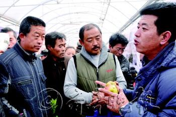 | 苗木会现场火爆,参展商的宣传资料备受果农关注。 实习生 吕奇 摄 |  | 现场专家在为果农传授苹果种植经验。 实习生 吕奇 摄 |