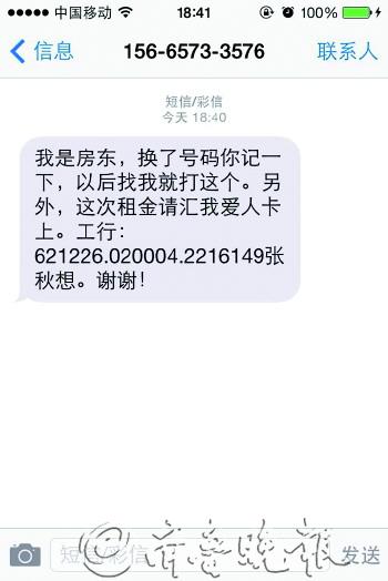 本报11月19日讯(记者 杨万卿 赵磊)房子租期到了,家住奎文区的赵女士收到一条收租短信,误以为是房东发来,她准备往对方短信所留账号转账3000元。由于对方一直关机,赵女士才起疑,经房东确认,短信并非他所发。 赵女士家住在东风街文化路的一处小区,19日,她收到一条短信,内容为“你好,我是房东,现在在外地出差,请把这次房租打到我爱人卡上……”短信末尾,对方还给出了银行账户和开户人的姓名。 由于临近月底,赵女士确实该交房租了,她并没有怀疑这条短信的真伪。等到闲下来,她就在笔记本电脑上准备转账,房租是3000元,考虑到应该先给房东打声招呼,赵女士找到发短信的号码,拨打多次,对方一直关机。 联系不上房东,赵女士起了疑心。随后,赵女士通过原来联系的号码找到房东,经房东确认,赵女士收到的是一条诈骗短信。赵女士很庆幸,3000块钱没有被骗走。但赵女士也因此心存疑惑:“我就不明白,骗子怎么知道那是我的号码,而且还知道我恰好要交房租呢?”