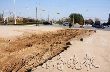 11月19日,天衢东路上的供暖管道铺设完成后,广川大道路口处的路坑还未填平,但围挡已被拆除,给经过的车辆造成安全隐患。 本报记者 马志勇 摄
