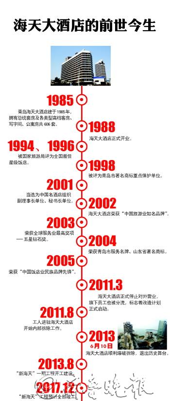 “新海天”建成后效果图公布,最高塔楼369米,将刷新青岛“第一高楼”高度。(图片来自规划局网站) 本报11月19日讯(记者 邱晓宇) 19日,海天中心项目一期工程规划方案公示,海天大酒店原址将建大型城市酒店旅游综合体,由三座塔楼和4层商业裙房组成,其中主楼高达369米,将刷新青岛“第一高楼”高度。 建于1985年的海天大酒店曾是青岛地标性建筑,今年6月爆破以后,新规划一直备受关注。19日,青岛市规划局发布海天中心项目一期工程规划方案,“新海天”设计方案及效果图终于面世。“新海天”建设地点位于市南区香港西路以南、万丽海景以东、东海西路以北、顺峰酒店以西合围区域。 根据规划公示,“新海天”是由三座塔楼和4层商业裙房组成大型城市酒店旅游综合体,包含了酒店、商务办公、商业、酒店式公寓多种业态形式。其中主楼高达369米,将刷新青岛高楼高度。三座塔楼分别是42层的五星级酒店和企业会所、75层的六星级酒店和写字楼、55层的酒店式公寓。三座塔楼地下相连,规划设计为4层,作为地下车库、地下商业和配套设备用房。 “新海天”项目工程分两期进行建设,一期工程主要是对原海天大酒店地块进行改造建设,二期工程对东侧冶金宾馆用地和顺峰酒店用地进行改造建设。此次公布规划的主要是该项目一期工程的建设内容。项目一期工程总投资约78亿元人民币,总占地面积约3.57万平方米,总建筑面积约46.92万平方米。目前,海天大酒店已经拆除完毕,项目建设单位为青岛国信实业有限公司,已于今年8月开工,预计于2017年12月底全部竣工。 相关链接 辉煌历史:曾接待65万宾客 青岛海天大酒店建于1985年,1988年正式开业,是山东省最早、规模最大的五星级酒店之一。从酒店的客房窗户向外眺望,就能看到一望无际的大海,这成为海天大酒店的一大亮点。虽然青岛五星级酒店越来越多,但一提起青岛的高级酒店或地标性建筑,青岛人首先会想到海天大酒店。海天大酒店经营了近30年,接待了65万海内外宾客,其中海外宾客51万人次。接待了近20位国家元首、政府首脑,以及众多国家的政坛要员、知名人士。 改造缘由:风雨20多年渐趋“脱节” 海天大酒店的改造是青岛市确定的一项重点工程,经历了20多年风雨的海天大酒店在功能配套、布局,软硬件水平上已经远远达不到打造顶级的旅游度假酒店的要求。具有历史厚重感的海天大酒店建筑外观与周围新建的高楼大厦形成巨大反差,在已经建成的万丽海景、东海路9号等高层建筑包围下,外观看起来老旧的海天大酒店显得有点“憋屈”。 怎样拆除:爆破声中“离世” 今年6月10日5时15分,位于香港西路48号的青岛海天大酒店一期、二期主体结构顺利爆破拆除。拆除时按照先二期楼体后一期楼体依次倒塌的顺序爆破,运用“重力弯矩空中解体缓冲坍塌拆除爆破新技术”和“综合时差起爆技术”使二期楼体向西南方向坍塌,一期楼体向东北方向坍塌。坍塌楼体的废墟全部落于海天大酒店自有区域,不会对周边道路、建筑产生影响。