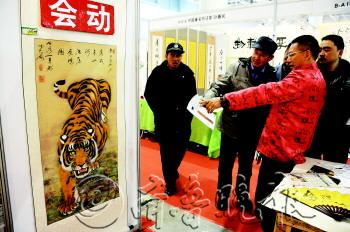 11月22日,71岁的台湾书法家杨大阁来到烟台秋季茶博紫砂艺术展,带来了采用唐伯虎首创、失传五百年的画“活虎”绝技绘制的画作。画中的老虎栩栩如生,无论从哪个方向看都能与之对视。此外,现场杨大阁还展示了一笔绘就的金龙画作。